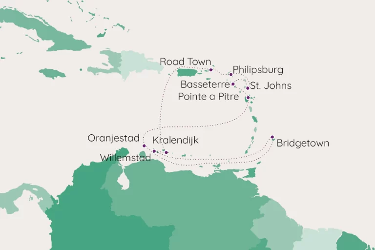 Celebrate Valentine’s Day in tropical paradise on this enchanting Caribbean sailing. Visit stunning destinations like Barbados, Curaçao, Aruba, Guadeloupe, St. Kitts, Antigua, St. Maarten, Tortola, Bonaire and return to Curaçao. Spend Valentine’s Day in picturesque Guadeloupe, strolling through its vibrant streets and romantic beaches. That evening, enjoy a special celebration on board, featuring outstanding cuisines, amazing entertainment, and loved up surprises under the starlit sky. Explore the unique charm of each island, from Antigua’s historic allure to Aruba’s white-sand beaches and Bonaire’s underwater wonders. This sailing blends romance, tropical sights, and unforgettable moments in the perfect Caribbean escape..