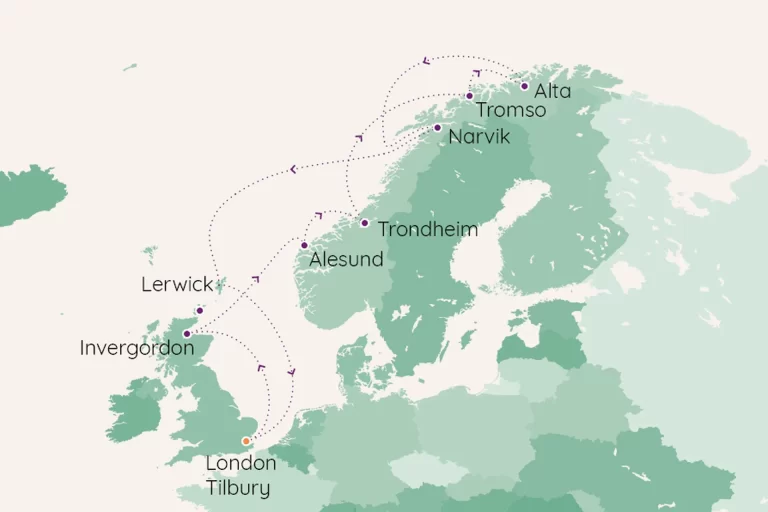 On this captivating North Sea voyage, discover scenic wonders including Invergordon, Trondheim, Narvik, and the Shetland Isles. Immerse yourself in coastal Scotland’s rich history, hunt the enchanting Northern Lights in Alta, and explore the picturesque charm of Lerwick. This sailing offers an unforgettable journey from the historic ports of Scotland and the Shetland Islands to the stunning Norwegian coast.