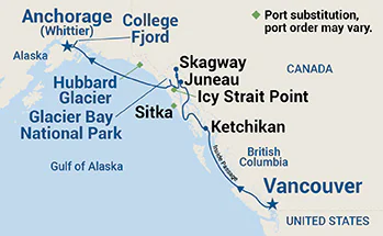 5 Ports: Vancouver, Canada Ketchikan, Alaska Juneau, Alaska Skagway, Alaska Glacier Bay National Park (Scenic Cruising), Alaska College Fjord (Scenic Cruising), Alaska Anchorage (Whittier), Alaska