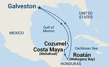 3 Ports: Galveston, Texas Cozumel, Mexico Roatan (Mahogany Bay, Honduras Costa Maya (Mahahual), Mexico Galveston, Texas