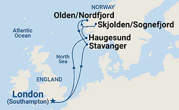 4 Ports: Southampton (for London), England Bergen, Norway Skjolden/Sognefjord, Norway Olden, Norway Stavanger, Norway Southampton (for London), England