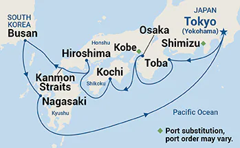 7 Ports: Tokyo (Yokohama), Japan Toba, Japan Osaka (for Kyoto), Japan Kochi, Japan Hiroshima, Japan Kanmon Straits, Japan Busan, South Korea Nagasaki, Japan Tokyo (Yokohama), Japan
